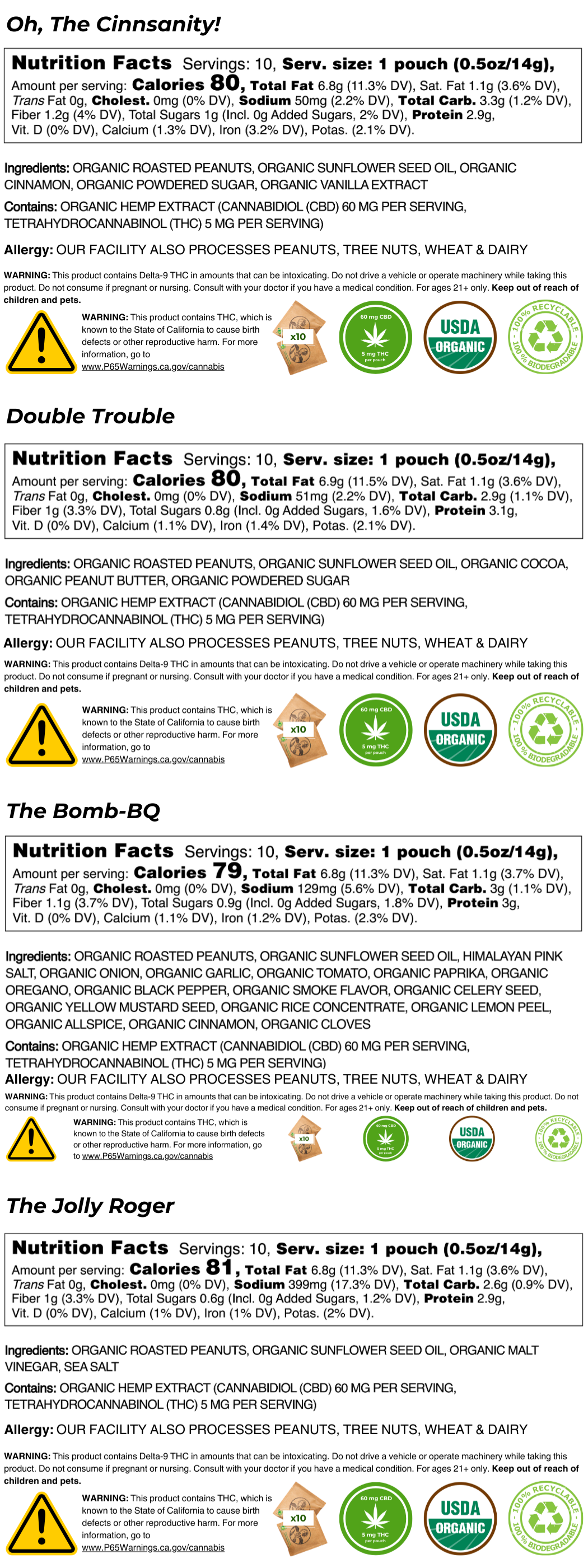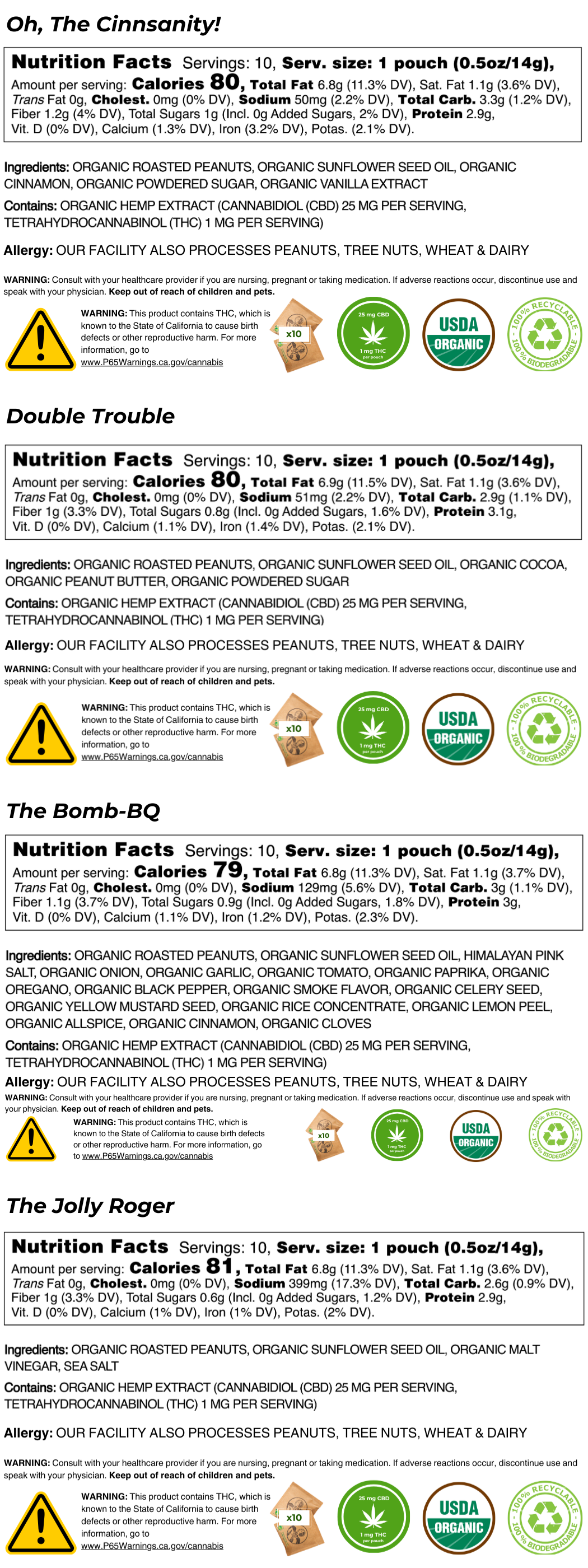 The feel-good peanut flavors included in the variety pack are The Bomb-BQ, The Jolly Roger, Oh The Cinnsanity!, and Double Trouble.